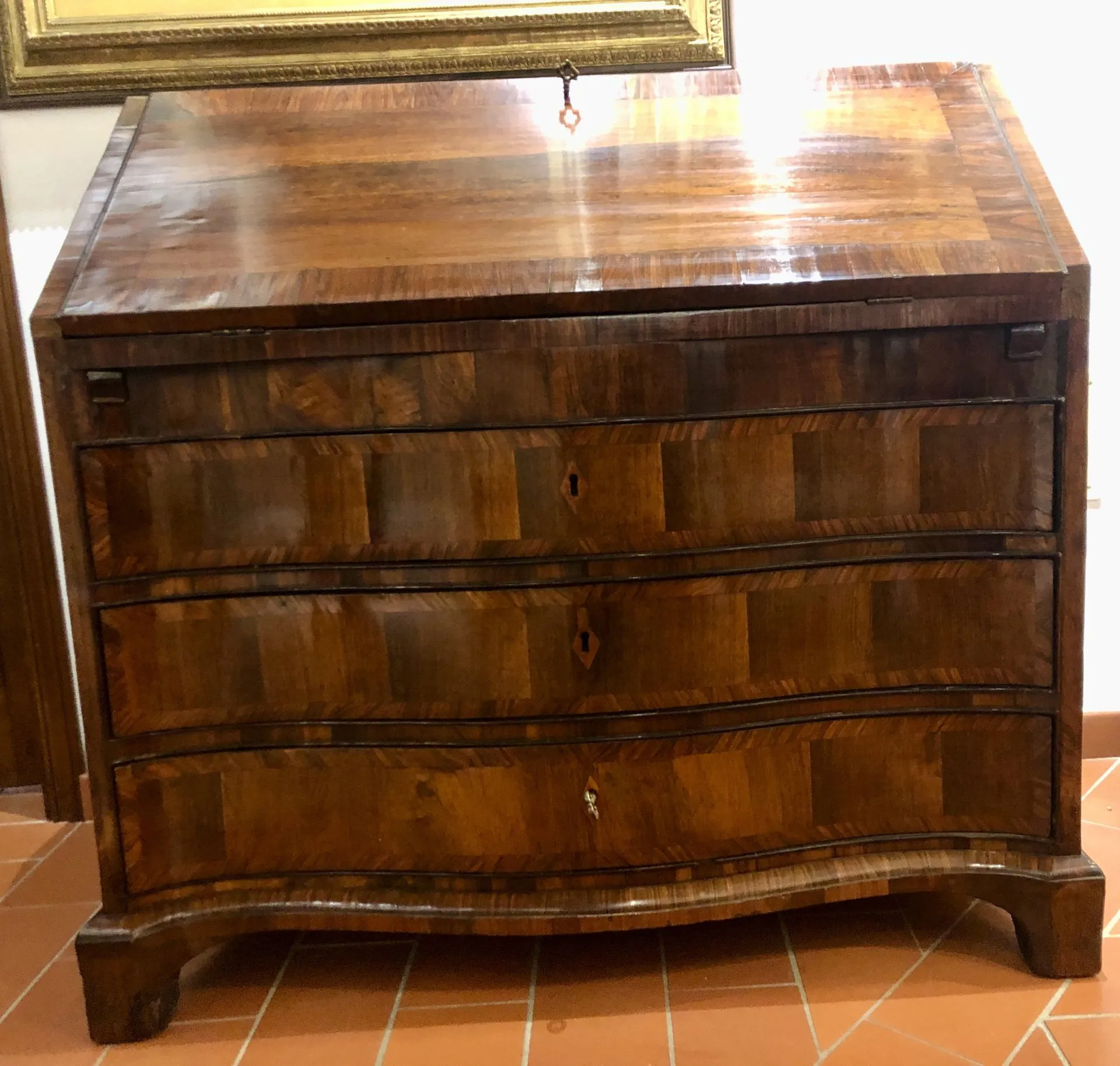 THREE DRAWERS, WAVELED ON THE FRONT AND SLIGHTLY ON THE SIDES. DRAWER WITH TWO SMALL DRAWERS INSIDE, TWO SHELVES, A DISAPPEARING DRAWER AND A SECRET DOOR.