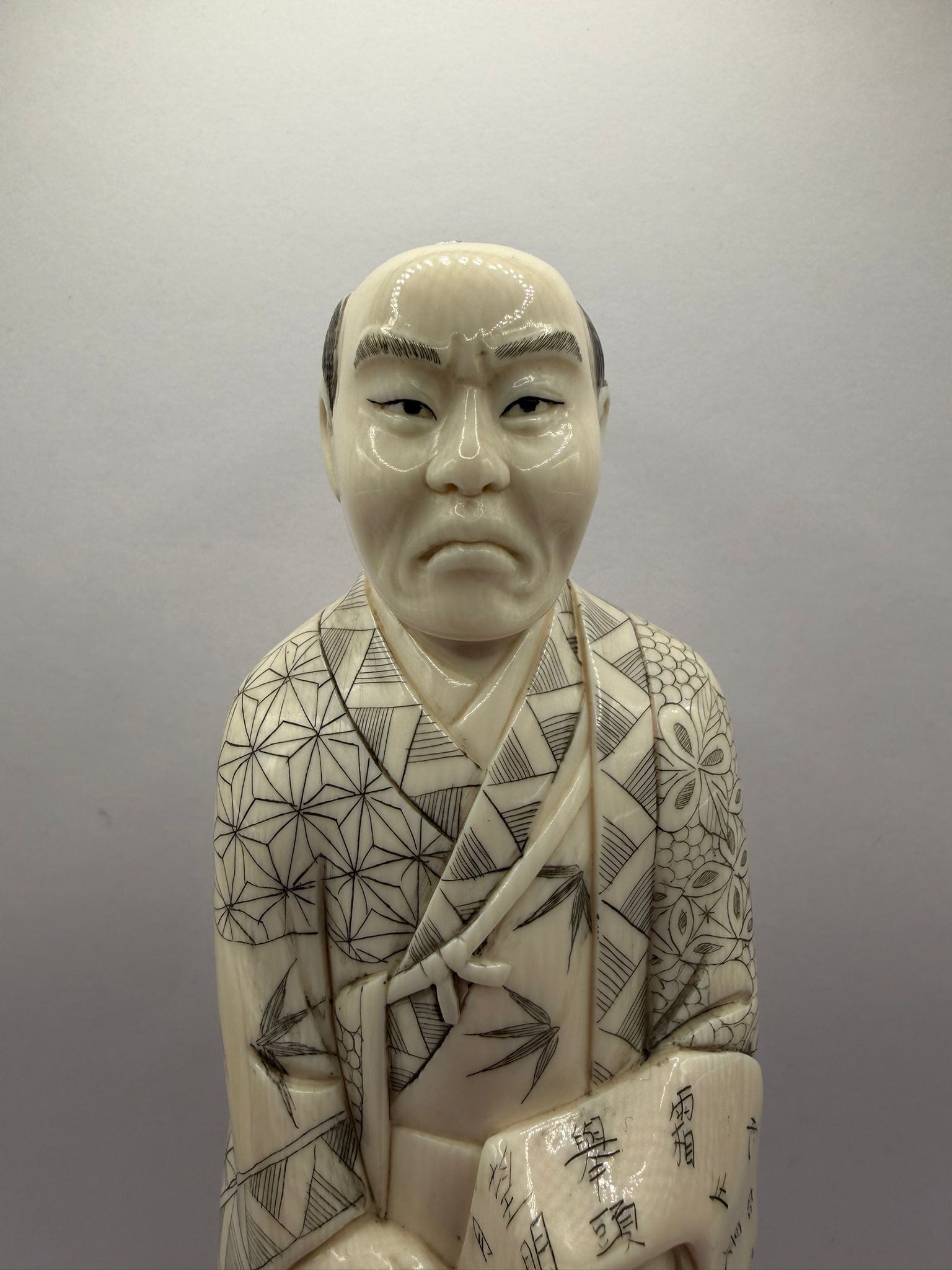 Statuetta in avorio pregiato, presumibilmente proveniente dalla regione del Siam, realizzata a mano in Giappone nel XIX secolo. Levigata a specchio e decorata con incisioni riempite di colori indelebili, di raffinata fattura artigianale, rappresentativa della scultura giapponese dell’epoca e ideale per collezionisti di statuette orientali e oggetti d’arte in avorio.