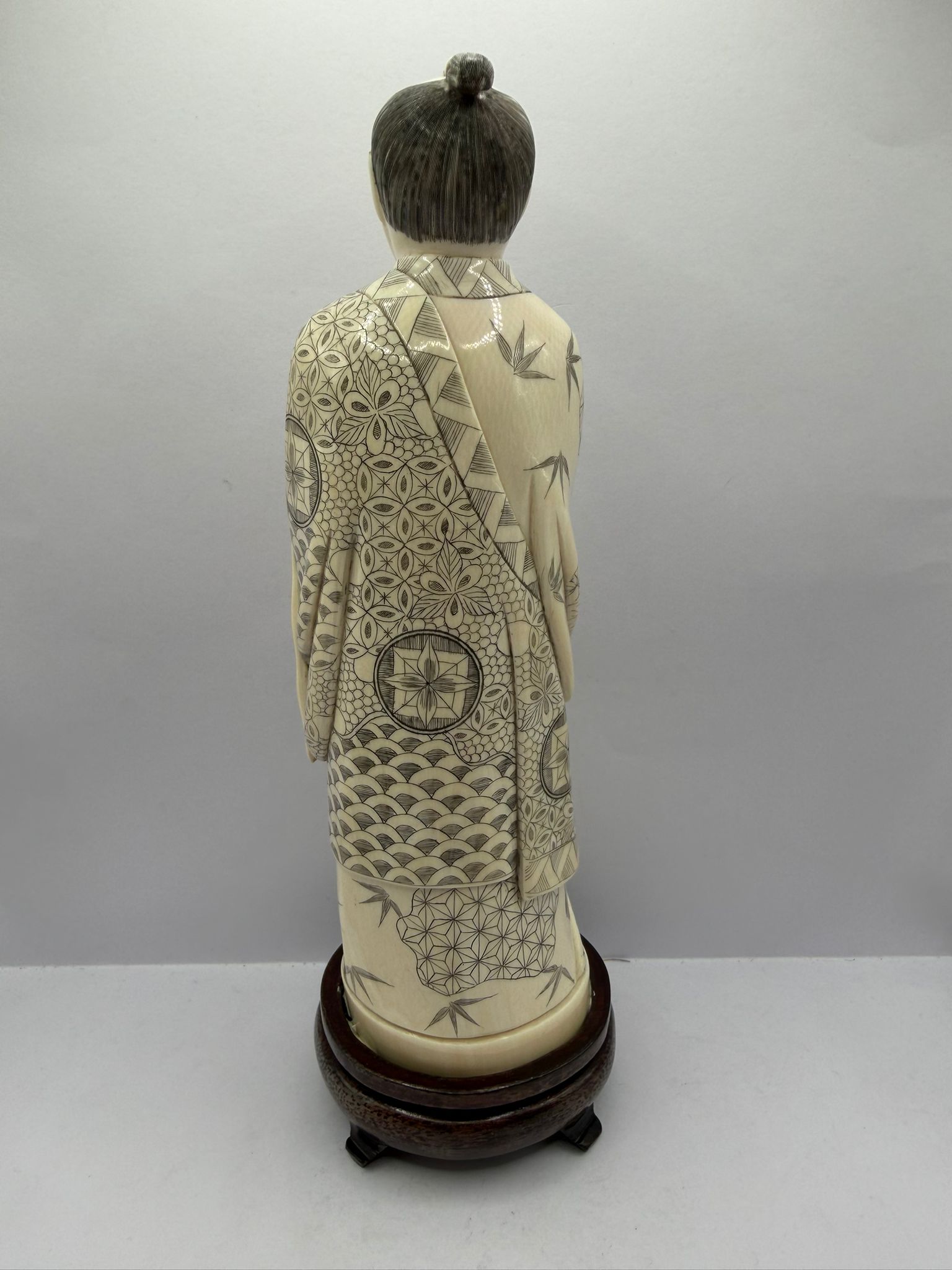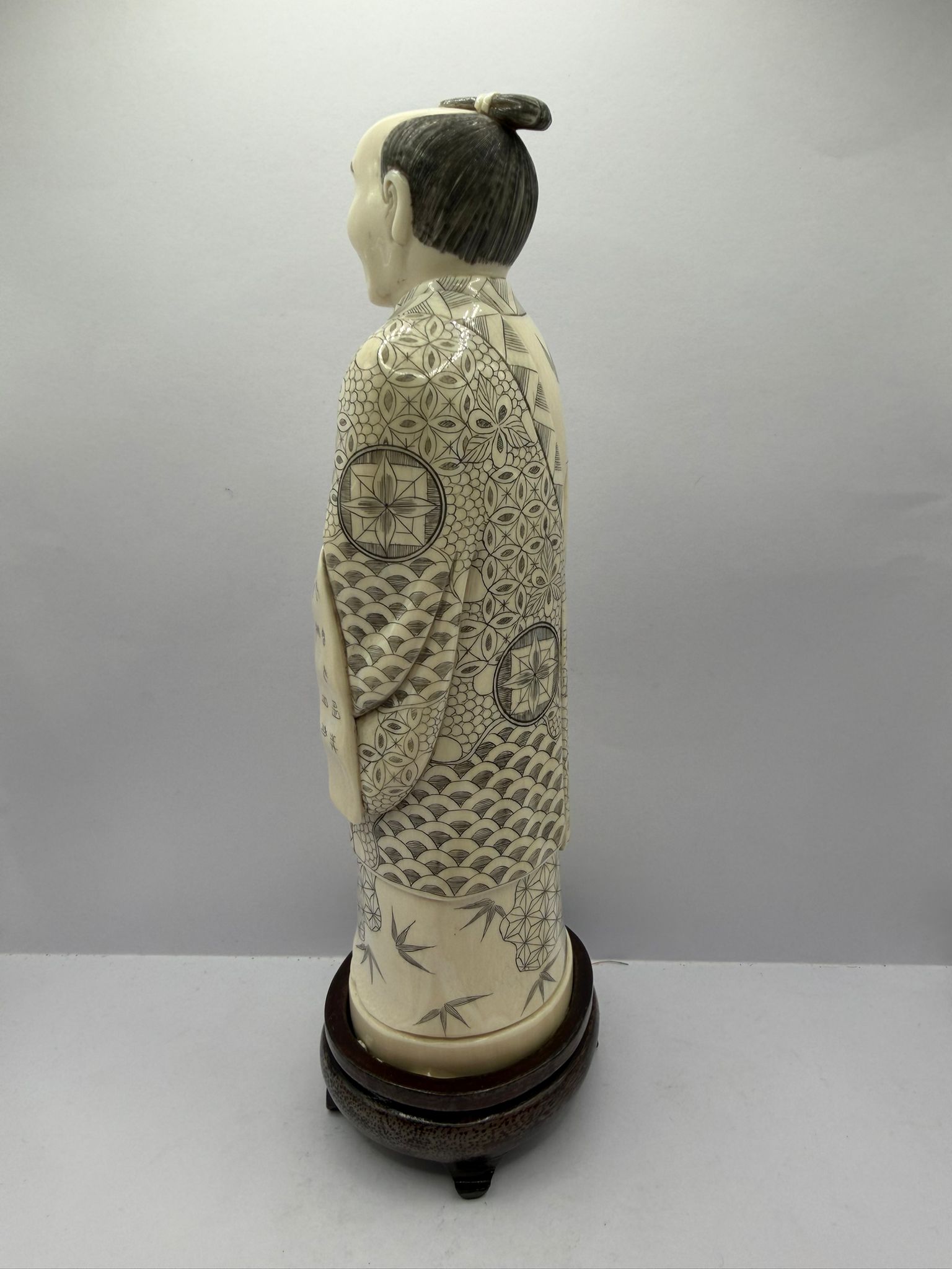 • Materiale: Avorio pregiato, presumibilmente proveniente dalla regione del Siam; lavorato a mano, levigato a specchio, incisioni riempite con colori indelebili